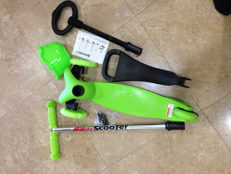 В итоге, после того, как я передала свой почтовый адрес и выбрала желаемую модель, ровно через день курьер привез нам самокат. Сыну 2,8 весит приблизительно 15 кг, поэтому выбор пал на самокат детский 3 в 1 MIDOU арт. MD-001 со светом, ярко-зеленого цвета.