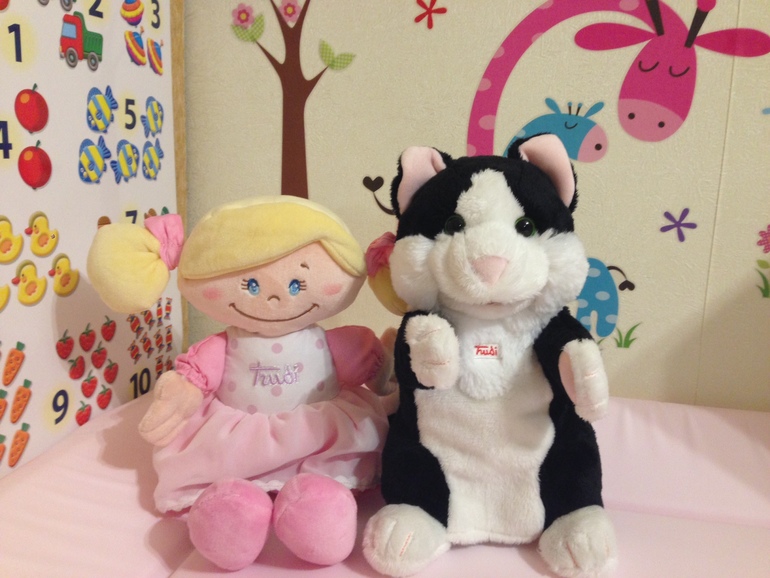 Первые месяцы жизни малышки было не до кукол))) Потом я заказала trudi. Симпатичная, в розовой одежде, но особого интереса она не вызвала. Кошка этой же фирмы пользуется большей популярностью.