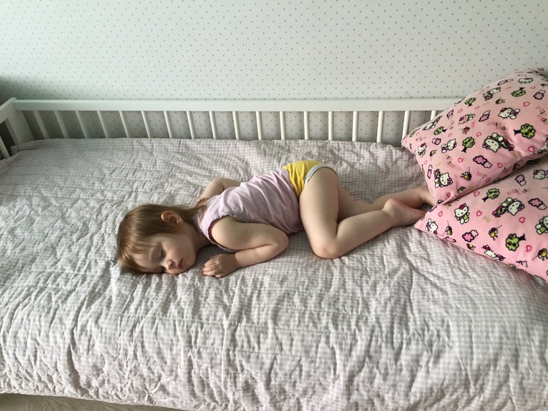 Вот так выглядит почти двухлетний ребёнок, ростом 87 см, внезапно уснувший на кровати старшей пятилетней сестры) просторненько, в общем. Матрас икеевский брали, нас устраивает вполне