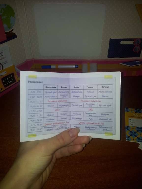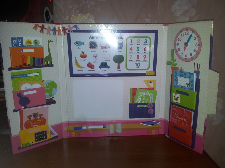 Раскрываем её и видим школьную доску,папки с различными школьными принадлежностями и часики(на которые мы так часто любили смотреть в ожидании конца урока)