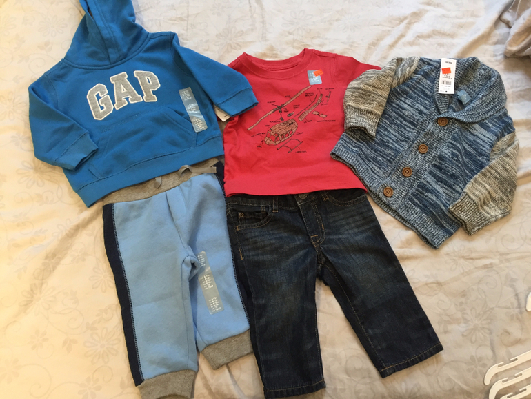 Ну и одежда из моего любимого ГЭПаааа... Все по скидкам, каждая вещичка не дороже 10 долларов, а большинство и дешевле, футболки и боди по 3-4 доллара. Я счастлива, как слон)