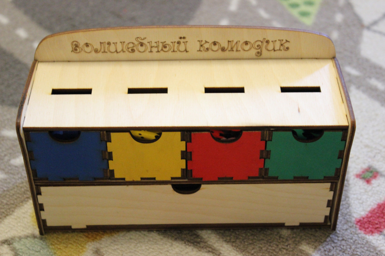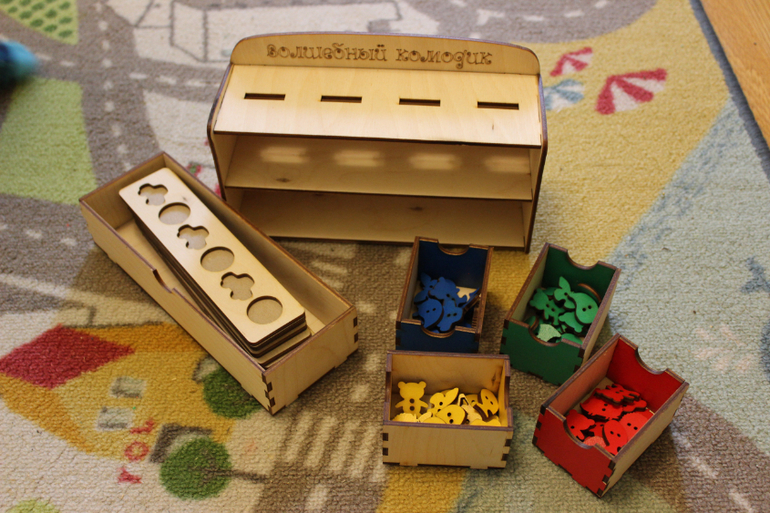 Волшебный комодик. Очень оригинальная игра, а главное очень вариативная. Можно сортировать, считать, выстраивать логические цепочки, вкладывать фигурки в рамочки, играть в тактильное лото, изучать цвета... Да и много чего еще. Для фигурок каждого цвета сделан свой ящичек, для рамок также свое отделение в комодике. Игру очень удобно и приятно хранить в таком виде. Сверху на комоде сделаны прорези, как в копилках, ребенок может таким интересным способом сортировать фигурки по цветам.