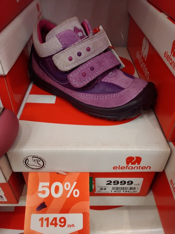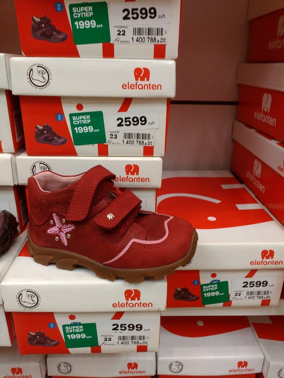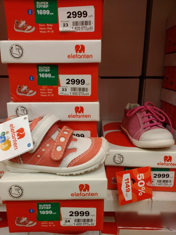 Добрый день! Спасибо за наводку!!! Первые за 1149руб забронировала - муж поедет выкупит, хотя далеко нам. Но за 1150 экономии можно и смотаться. Сегодня их померили в ТК Весна за 2299 - нам отлично подошли. В ТК Весна сегодня была последняя пара открытых синих сандалий Элефантен на мальчика разм.23 (15см-померила) за 649руб (при начальной 2999руб.) арт.1402667 (фото нет, т.к.телефон у меня обычный).