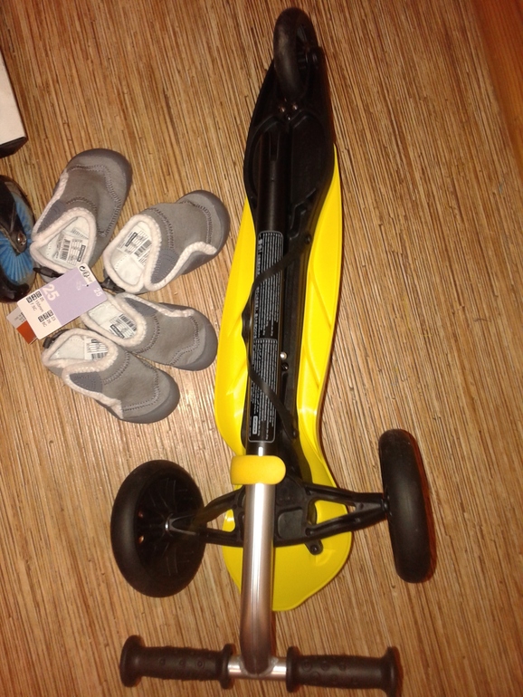 Первым был куплен двухколесный, подарили его старшему в честь рождения младшего в январе. Не важно, что был мороз под 30 градусов, нам же нужно было обменять на что-то коляски старшего. Поэтому, топая из сада по снегу, на возмущения "это моя коляска!" я напоминала, что "большие мальчики катаются на самокатах", и за пару-тройку раз вопрос с принадлежностью колясок закрыли. На самокате катался по подъезду.