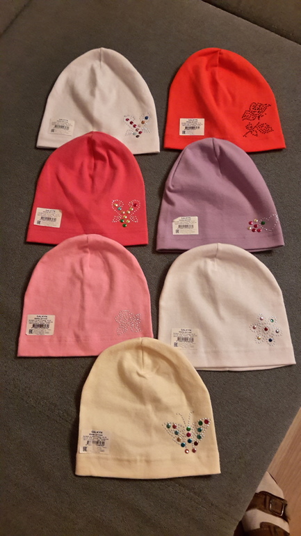 Носим их с года,сейчас дочке 2 на днях и они чуть великоваты ещё. Только я стразы убираю(не люблю их) и термонаклейки клею из магазина для шитья(они там копейки стоят,да шапка смотрится лучше). А так эти шапки ничем не хуже,тех что за 200р продают.