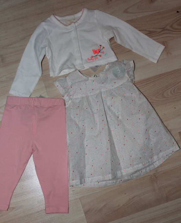 Комплект кул клаб. Кардиган, платье, лосинки. Все хлопок. Платье тонюська, прям на сейчас супер будет. Размер 68, цена 699. Был еще в размере 80 см.