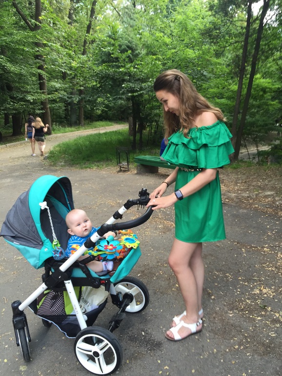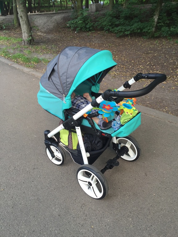 Я очень довольна. Коляска просто плывет по дороге, возможно благодаря надувным колесам. Цвет тоже интересный...бирюзовый, но не яркий. Капюшон прям до бампера, накидка на ножки. Весит 13кг, я с ребенком сношу по ступенькам в руках после лифта, где-то 15-20ступенек . В старый лифт проходит, ширина шасси 60см.
