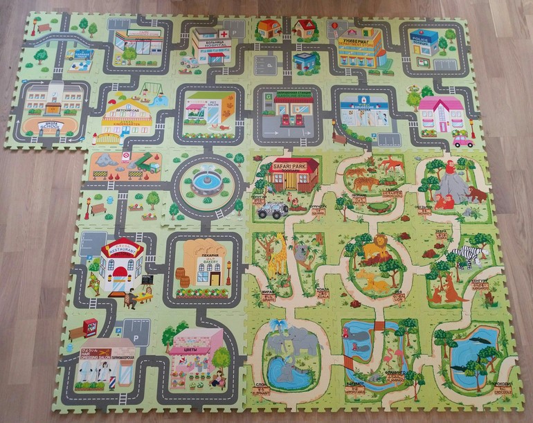 После неудачного (на мой взгляд) приобретения коврика-пазла с вынимающимися элементами, я купила на пробу зоопарк из этой серии. Потом докупила еще два осташихся. Четвертый, как планировала, скорее всего покупать не буду, хотя посмотрим, когда будем делать детскую.