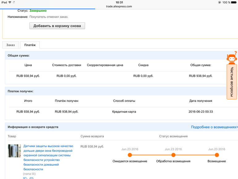 Так же меня удивляет, что судя по принт скрину кот я прикрепила, деньги с али считаются зачисленными прям в этот же вечер что я и отменила заказ. Я заказывала 23 июня вечером, ну в Китае утро и стоит что прям этим же днем пришел возврат. Разьве так быстро бывает?