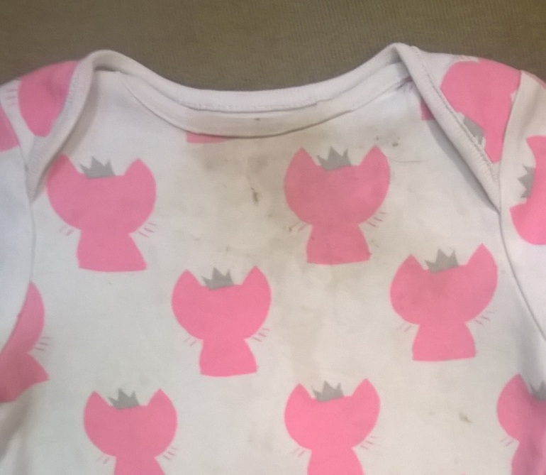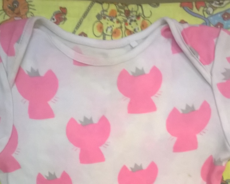 И специально для вас я решила провести эксперимент с одним из наших прошлогодних боди, в котором дочка "кормилась" овощными и фруктовыми пюрешками. Честно, результат меня поразил. До: