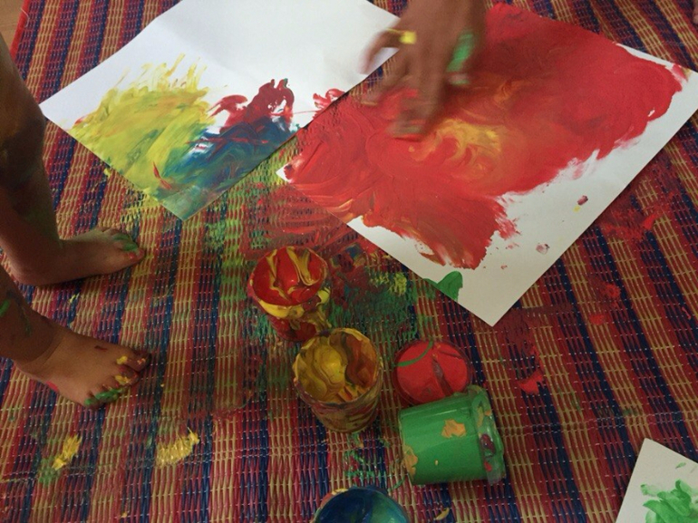 Ребенок (1 г 7 мес) сначала рисовала пальцами, потом брала в ручку огрмоное количество красок и рисовала себе на попе. Была вся к красках)