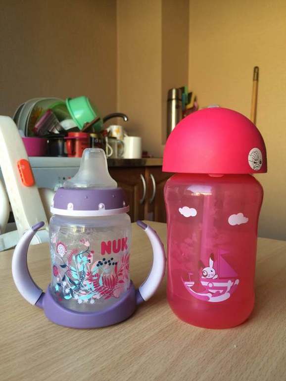 На данный момент пользуемся 3 поильниками. Самым первым приобретённым Нюк(с него пьём детское молочко с утра), Поильником Авент с трубкой (для ежедневного использования) и просто кружкой с обыной трубочкой(для кефира вечером).