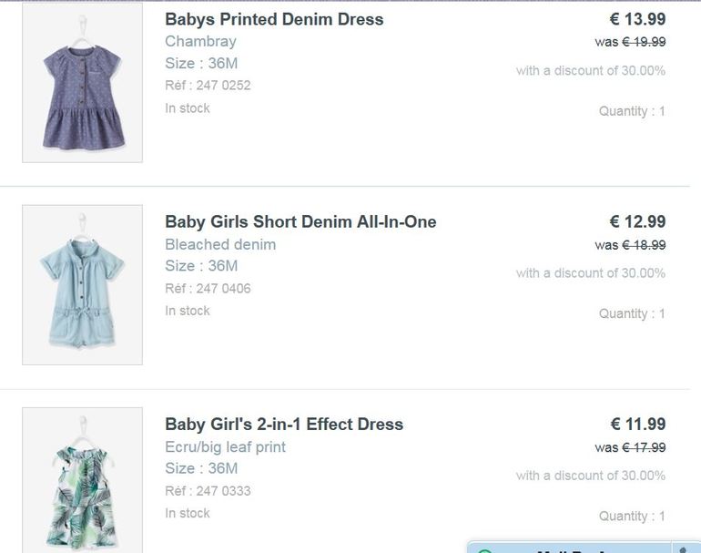 К качеству претензий нет, вполне соответствует скидочной цене, заплатила около 24 евро за все. Вещички понравились, все как на картинке, но маломерит ужасно. Размер 36 месяцев-94см - такой же как у платьев мазекея 12-18(!!!). Брала на вырост, думаю поносим от силы до 2х лет.