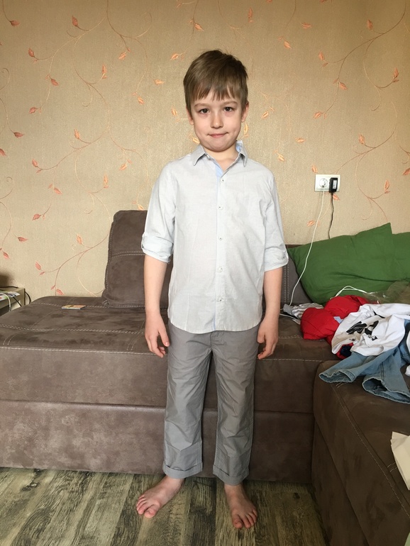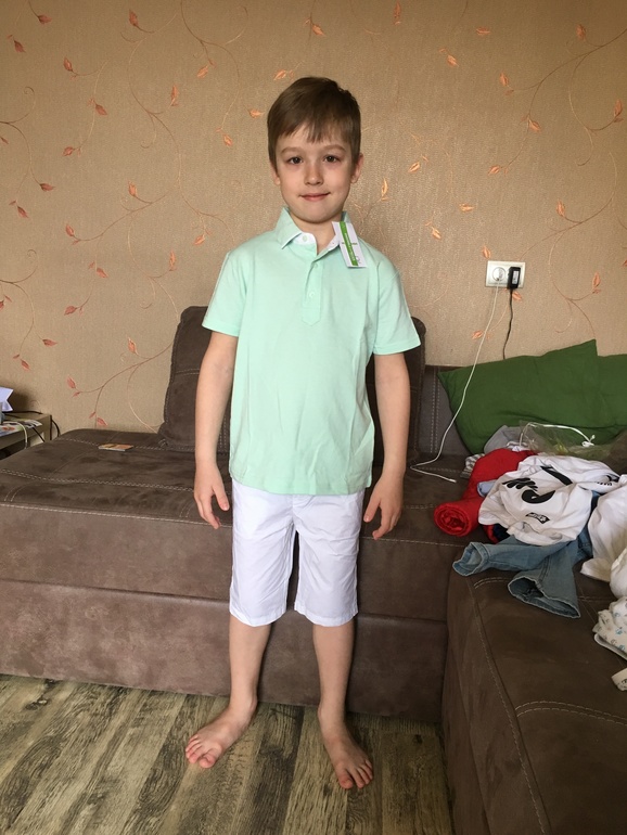 Размер 9 на рост 128. Ткать тонюсенькая - у всей одежды. поло прям просвечивается. Шорты сели впритык. Штанишки большеваты. Рубашка узковата... хорошо, что купила со скидкой и бесплатной доставкой..., за полную стоимость было бы жалко отданных денег. Больше заказывать не буду..