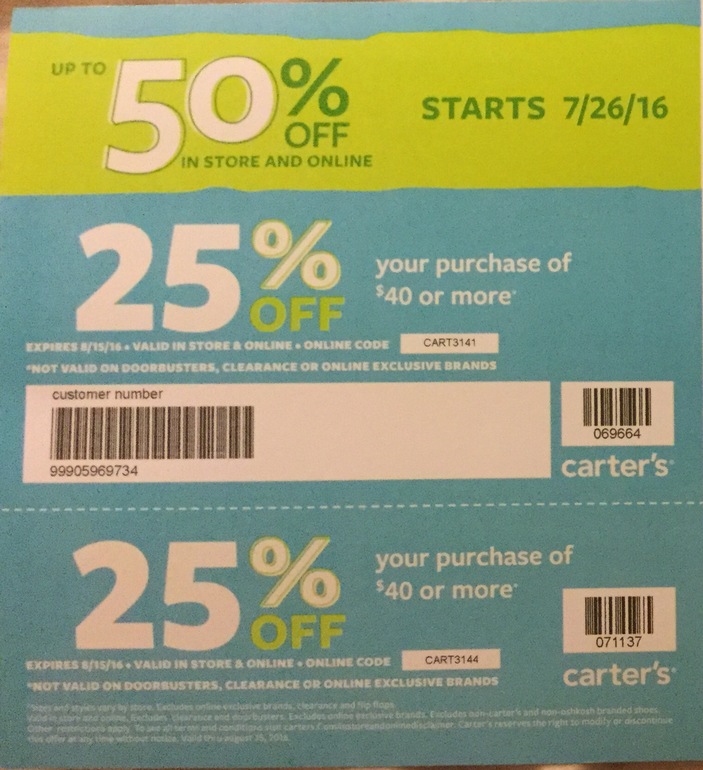Личные скидки ( не распространенное)В carters.com сейчас распродажа плюс к ней плюсуются скидка по купону.