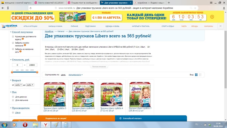 Акция на маленькие пачки трусиков либеро при покупке 2 шт. любого размера (в пересчете на единицу получается выгоднее гораздо, чем большие пачки брать):