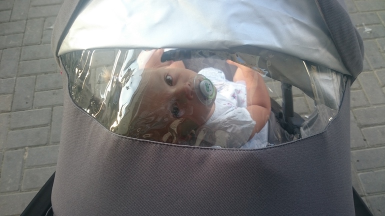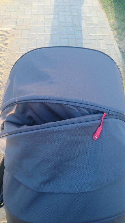 Капюшон у Phil and Teds очень большой, если расстегнуть молнию на капюшоне(это увеличитель), тогда он получается до самого бампера, есть смотровое окошко для ребенка.