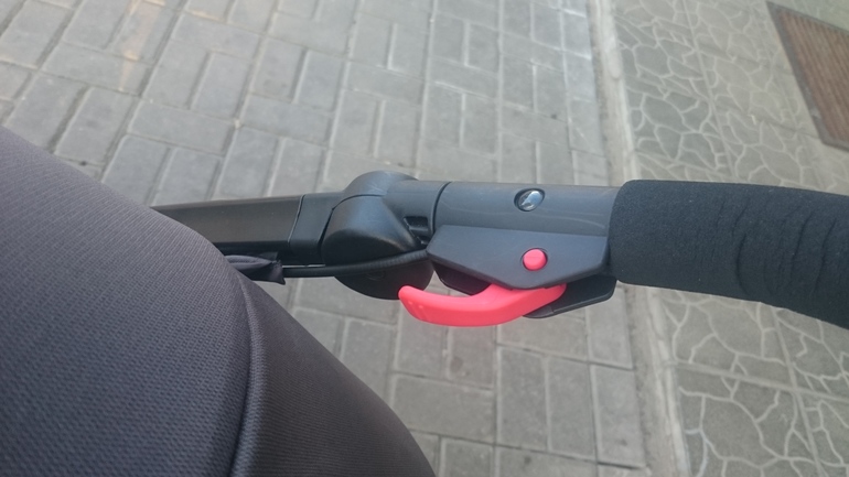 Тормоз ручной и компактный, он вообще не мешает на ручке, нажал и коляска как вкопанная никуда не уедет без надобности.