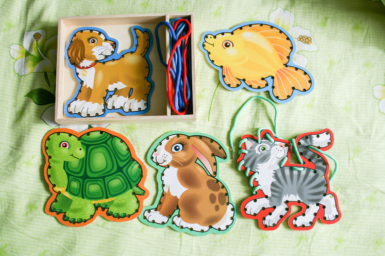 8) Начинали мы с самых простых шнуровок в линию по краю Melissa & Doug Lace and Trace Pets Тонкая двухсторонняя фанерка с дырочками, плотный шнурок, все в деревянной коробке отвратительного для пересылки веса. Соответствует стоимости.