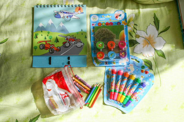 2) набор из 10 очень классных, мягких, ярких, а главное маленьких (что значит безопасных в пути) восковых и грифельных карандашей и 5 фломастеров. Не ожидала за такие деньги. Все их сложила с пакетик от ватных палочек на затяжке, добавив немного наших Crayola-вских из дома, и вуаля!