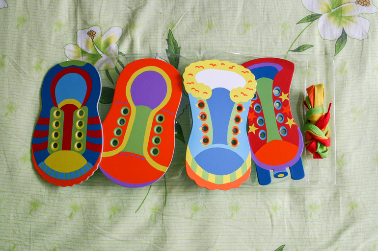 Шнуровки. У нас подошел возраст, когда надо прививать навыки шнурования и учить завязывать шнурки. Нанизывать бусины Даник умеет с 1 года с копейками, а вот что я накупила для навыков завязывать ботинки: