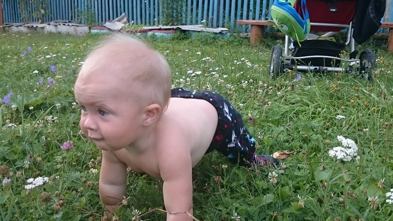 На даче другого выхода нет, либо ползать по траве, земле, песку, (между прочим больше всего ему нравится земля и щебень, а вот трава и песок не котируются))). Либо дома сидеть, а лето выдалось на славу, дома жара и духота. И, да, кусала пчела, ножкой встал на неё. Теперь смотрит куда ручки ножки Ставить)))