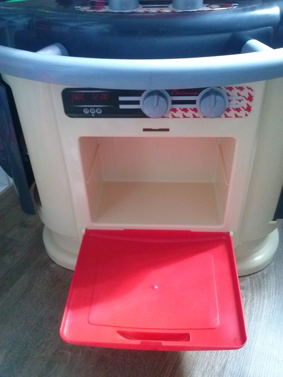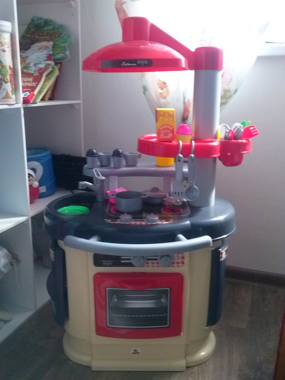 Заинтересовала она меня тем, что спереди у нее духовка, кстати с полочкой сетчатой (ее нет на фото, с ней сын играл). Смотрела варианты кухонь, где ни в духовке, ни в холодильнике не было полок, хотя цена от 7тр(( Так что это плюс