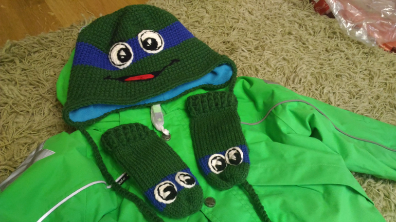 Дальше я заказала под этот комплект шапочку и варежки черепашки-нинзя, это самовяз, вязала девочка из ВК.