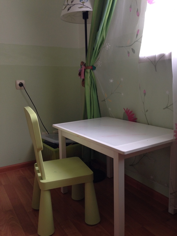 мы купили стул кид фикс на кухню и все рисование у нас не в комнате. В 1.8 -3 года все детское творчество очень грязное (если это творчество), а в комнате ковер, светлые обои и белая мебель. Для сборки конструктора и раскладывания причендалов доктора у нас столик лакк за 500 рублей и стульчик пластишка (в гостях у бабушки отдали соседи, дочь с этим стулом отказалась расставаться).
