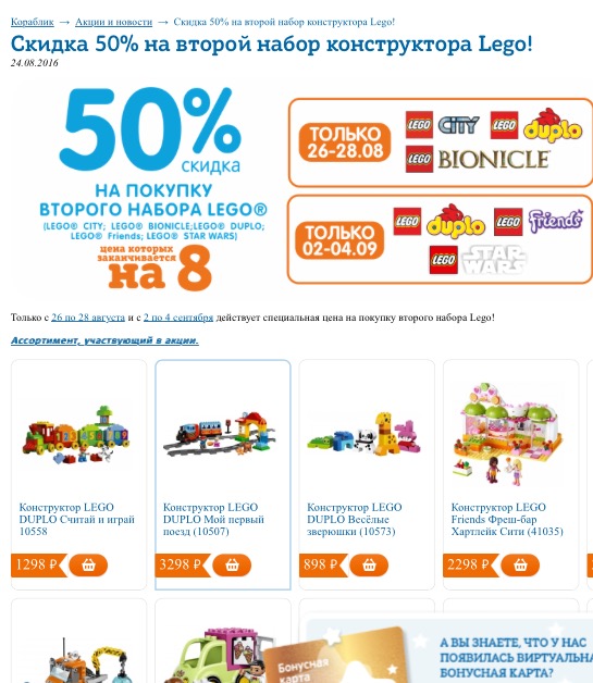 В Кораблике очередная акция на Лего, конечно не так выгодно как 1+1, но и ассортимент побольше.