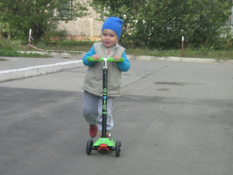 У нас почти как второй. У него регулируется ручка под рост. Сама на нем катаюсь периодически ;)
