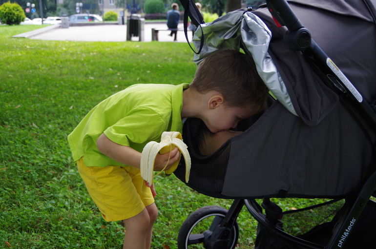 Привет! Как жаль, что вы не слышите меня. Их оказалось двое. Нет, трое, конечно, но мамочку катать я не смогу. Хоть она и худенькая, но весит точно больше положенных мне 20 кг. А вот малышей двое: маленький птенчик (а он и правда похож на воробушка своими растормошенными волосенками) на руках у мамы, она называет его Антошкой. На вид месяцев 8, хорошенький такой, улыбчивый! А второй, постарше, Платошка, стоит рядом и смотрит с интересом. Из их разговора я понял, что мы едем в парк на пикник. Там мне предстоит помочь им довезти еду и игрушки. Поехали! Совсем немного времени в пути и вот снова они - берут меня на ручки, наконец-то! Расклаааадываюсь, готов! Кажется, первое впечатление произвел. Ну, птенчик Антошка, иди ко мне, в мои надежные объятья!