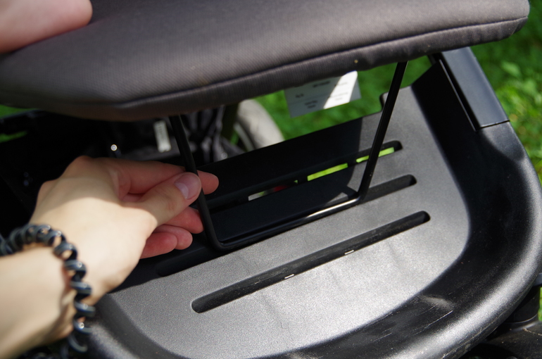 У коляски очень классный бампер, открывается одной рукой в любую сторону. Чуть нажимаем на рычажок с давлением наверх и тянем бампер.
