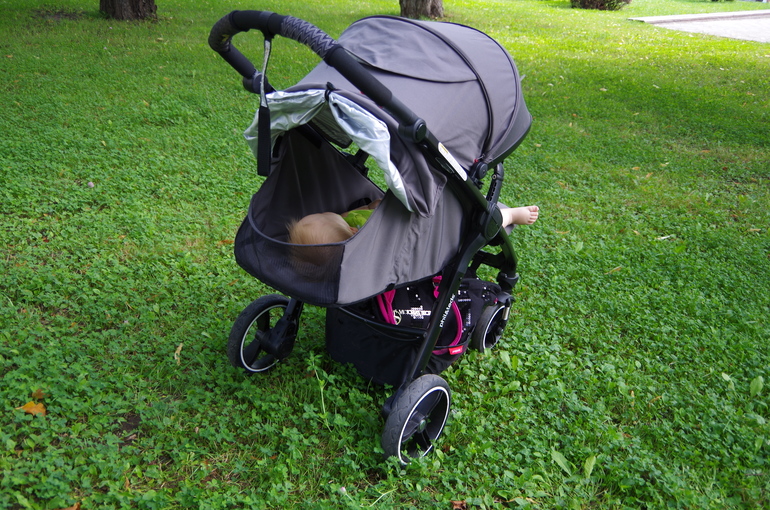 Коляска разложена и готова везти младшего сына и нашу волшебную сумку. И то, и другое размещаются отлично. Корзина вместительная и доступ к ней с любой стороны вполне удобный. Сыну очень просторно и хорошо, он сразу засыпает: это очень показательно для коляски. Тут в действии большие бесшумные колеса и амортизация.