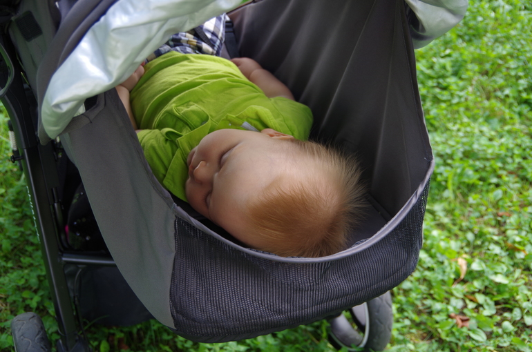 Пока я плавно ехал по дорожкам, малыш сладко заснул. Опускаем спинку, чтобы было удобно и поднимаем подножку.