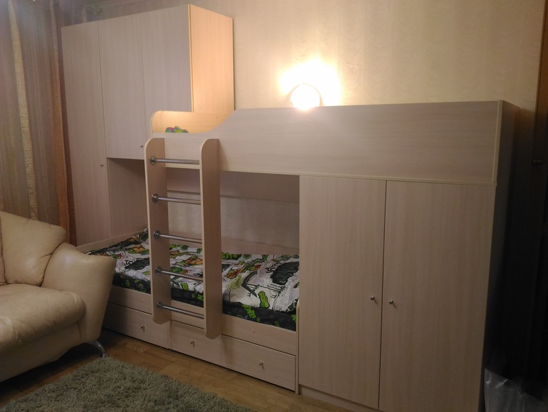 А мы вот такую приобрели неделю назад, у нас первый опыт с двухъярусными кроватями, поэтому выбирала недорогую, чтобы если вдруг не понравится было не жалко на дачу отправить. Но всем она очень понравилась, плюс функциональная, хорошие шкафы, глубокие!