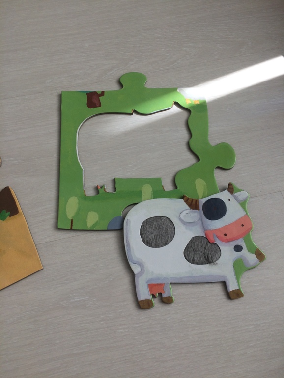 А сами пазлы... В них невозможно не влюбиться. Они гладкие, яркие, так приятно их держать в руке. Все животные узнаваемые - Платоша с легкостью показывает кису, коровку, курочку и прочих обитателей фермы