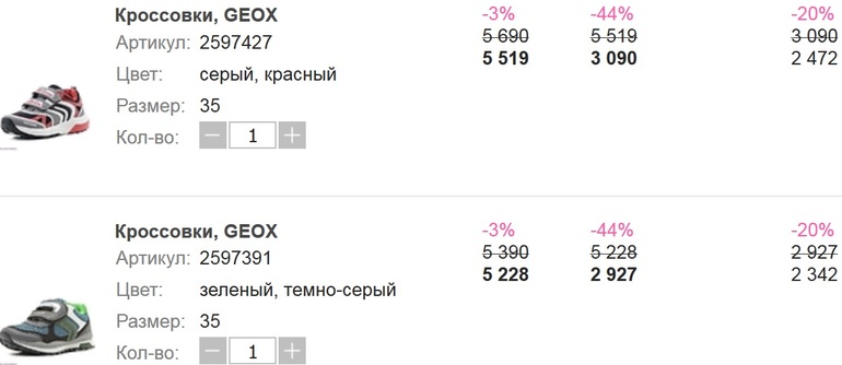 В детском мире ГЕОКС были кроссовки 35,36 размера,с бонусами 1600 выходили.