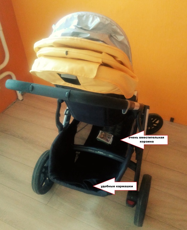 По поводу той самой корзины, в которой мы везли килограмм 10 добра. UppaBabyпокоряет сердца мам-тяжеловозов, потому что вмещает аж 13,6 кг. В нашем случае вместила сумки и беговел, на котором старший трехлетка, как почему-то у детей принято, благополучно выехал, проехал полдороги, а потом участливо поинтересовался, как же ты, бедная мама, понесешь теперь мой беговел, ведя коляску. Так вот, с UppaBaby Vista