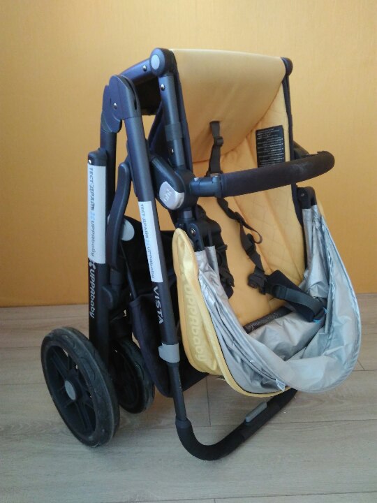 Ах, да! Чуть не забыла! Коляска очень удобно и довольно компактно складывается по типу «книжка» и стоит в сложенном виде. То есть ее удобно хранить и перевозить в машине. А в сочетании с вышеупомянутой возможностью установки автокресла UppaBaby Vista становится настоящей находкой для поездок по магазинам.