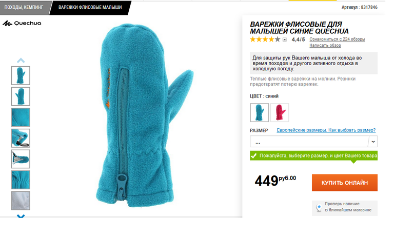 Детская одеждау нас были в прошлом году такие из декатлона. Очень удобно одевать на ручку, и не промокали особо ( конечно, это не непромокайки, но флис там не намокает мгновенно, как шерсть, например)
