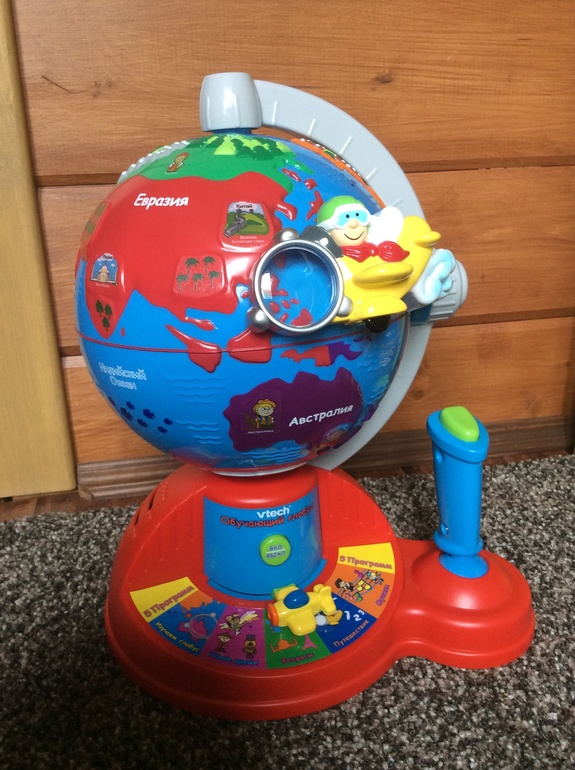 2) глобус Vtech. Странные у меня от него впечатления. Вроде бы все хорошо, но мало... Для чего нужен-первое понимание, что земля круглая, континенты и океаны. Стран мало, достопримечательностей тоже, музыку можно и поинтереснее подобрать. А больше раздражает фраза при выполнении определенного задания "Ты угадал!". Так и хочется сказать "Не угадал! Я знал". Еще все-таки идея с пультом управления, хоть и красивая, но не очень удобная. Дочь постоянно хочет руками подкрутить.