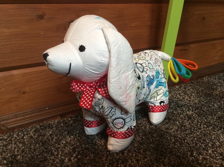 3) Imaginarium, набор "Раскрась игрушку из ткани" собака. Очень понравилась и идея, и исполнение. Собачка в таком комбинезоне с рисунками, которые надо разукрасить и 4 фломастера. Все можно стирать. Уж насколько дочь не любитель разукрашивать и то прониклась... Несколько дней с собакой не расставалась.