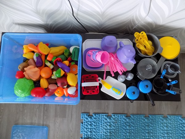 К ней кухонные принадлежности (Спектр и от плиты), муляжи овощей и фруктов (Нордпласт, Огонек), разрезные на липучке (серия "Помогаю маме").