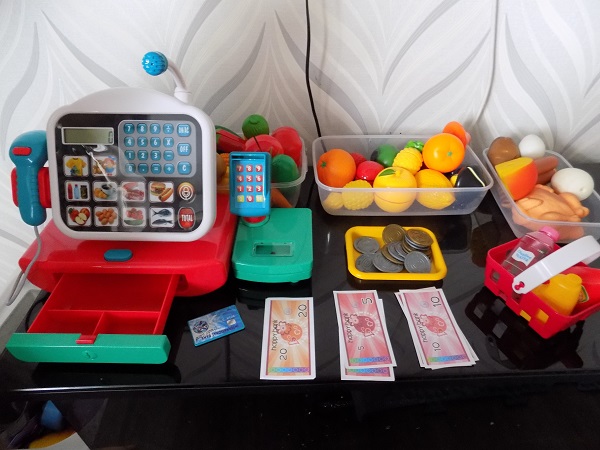 К ней же касса из Ашана. Докупила не так давно. Касса супер. Все пищит, табло с калькулятором настоящее.