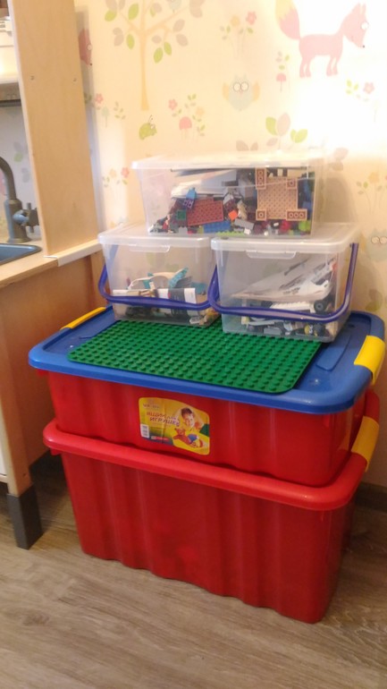 У нас прозрачный контейнер на 60 литров и отдельно не большой для рельсов. Хотелось тоже поделить сначала, человечки отдельно, что-то там отдельно, но потом забила. Дольше сортировать после игры. Надоело в общем. )