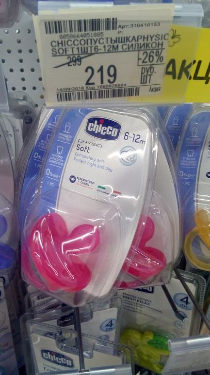 Пустышки и прорезывателиСегодня была в Детском мире и увидела, что у них идет акция на товары Chicco, а именно на пустышки, до 29 сентября скидка 25%. Я конечно не смогла пройти и накупила пустышек моей принцессе, тем более, что признаем мы только такие пустышки и никакие больше. Взяла Physio Soft (они полностью силиконовые, ортодонтические, у нас только эти пустышки держатся во рту и никуда не выпадают) как обычно, на сейчас 0+ розовую, а еще не смогла устоять и взяла сиреневую, зеленую на вырост, пусть будут, потому что соски покупаем регулярно, а когда такая приятная цена, конечно хочется урвать всего и по больше. Думаю, муж получит зарплату еще прикуплю. У нас в Детском мире выбор еще большой, прям разные цвета, на разный возраст и т.д., в общем есть из чего выбрать. Сижу довольная как слон с ощущением выполненного долга) деньги сэкономила, поэтому купила еще и старшему игрушечку.