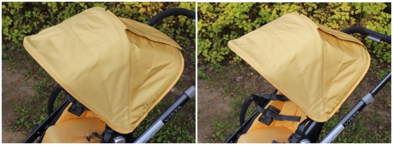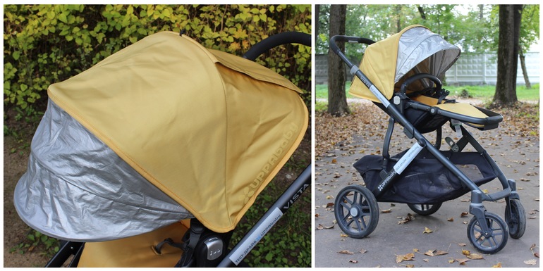 Еще одним плюсом является то, что внутри капора вшит отражающий материал, который позволяет защитить ребенка от ультрафиолетовых лучей во время нахождения в коляске. Так же во время сна ребенка или при палящем солнце отражающая часть капора выдвигается вперед, что увеличивает его размер и почти полностью скрывает ребенка от солнечных лучей, взглядов прохожих и непогоды.