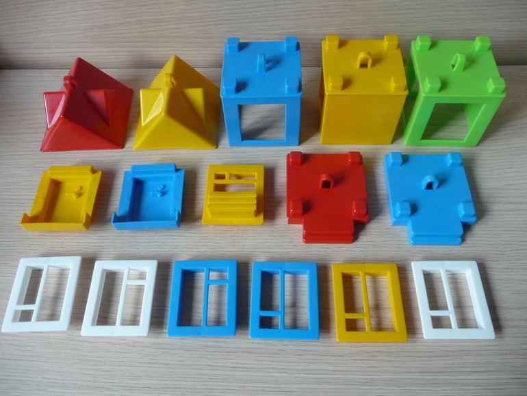 Конструктор включает 16 элементов, куда входят: этажные блоки в форме куба с одной глухой стеной и тремя проемами для окон и дверей, окна, двери и крыши. Одно окно имеет балкон. Также конструктор включает опоры (блоки с лестницей), можно, наверное, назвать их фундамент, на которых размещается дом. Комплектация: