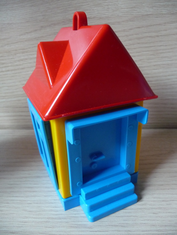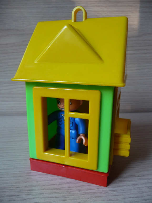 Раз есть домики, то должны быть и жители : )) Поместятся туда человечки данного производителя (нет в наборе) или фигурки из Киндер-сюрпризов и Лего Дупло. Вот только, чтобы засунуть игрушку в домик, надо снять либо дверь, либо окно, либо фундамент (блок с лестницей), что не очень удобно. Можно было бы разместить игрушку на балконе, но пол балкона возвышается над полом домика, потому на этом выступе еще не каждая игрушка поместится. Петля на полу мешает посадить фигурку.